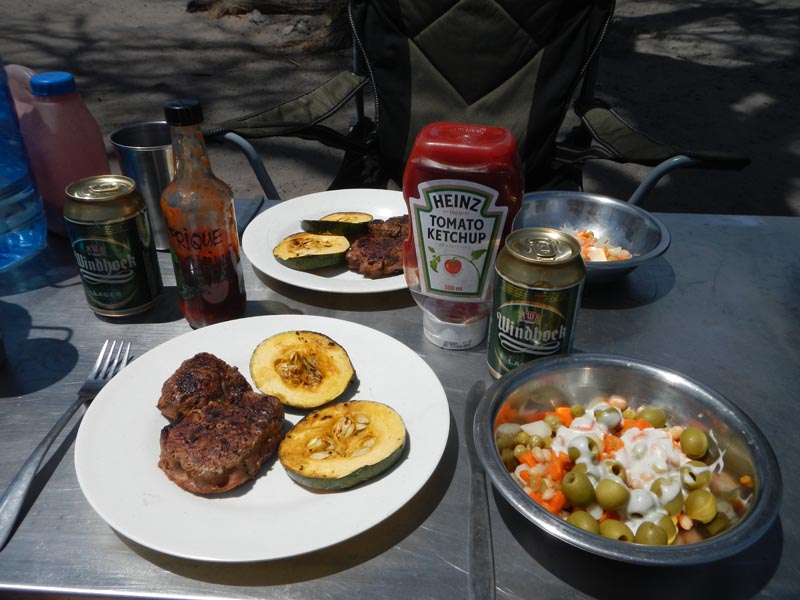 Auf unserer Campsite gibt es zuerst Mittagessen. Wir grillen wieder ein Rinderfilet.