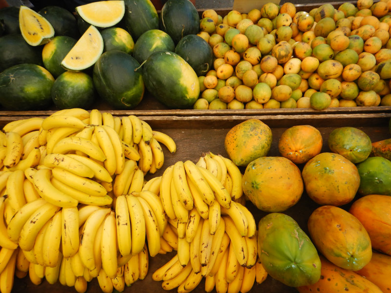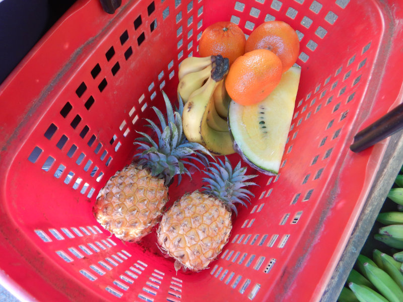 Wir kaufen Ananas, Bananen, Mango, Mandarinen und ein stück Melone.